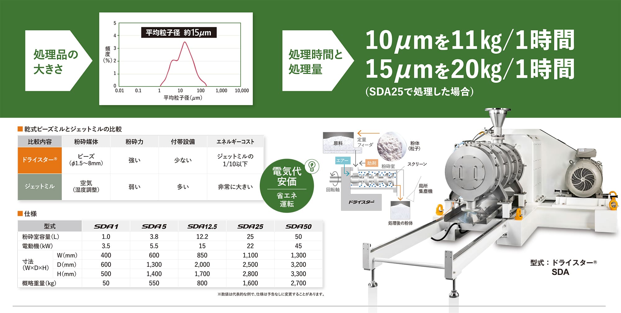 こうした背景を踏まえ、アシザワ・ファインテックは、抹茶を高品質かつ大量生産を可能にする粉砕機「ドライスター🄬 SDA-T」を提供します。