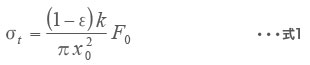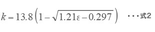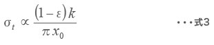 ここで、 σt は粒子層の引張り強さ、ε は層の空間率、k は配位数( 1 個の粒子が平均何個の粒子と接しているかを示す値である。例えば、k は式 2 と表せ、ε との相関がある)。x0 は層を構成する一次粒子の直径(粒子径のそろった球形粒子)であり、F0 は 2 粒子間の付着力である。微小な粒子では、 F0 は x0 に比例することが多いので、前述の式 1 は式 3 となって、