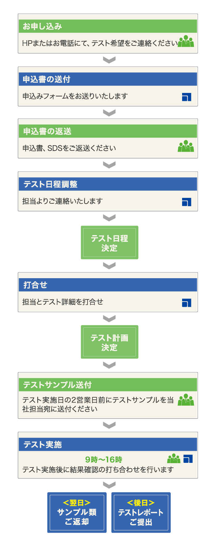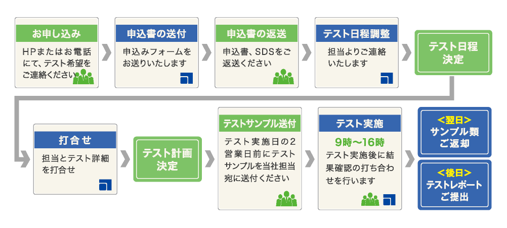 - テストサンプルをご検討頂き、営業担当者へご連絡ください。申込書を送付いたします。